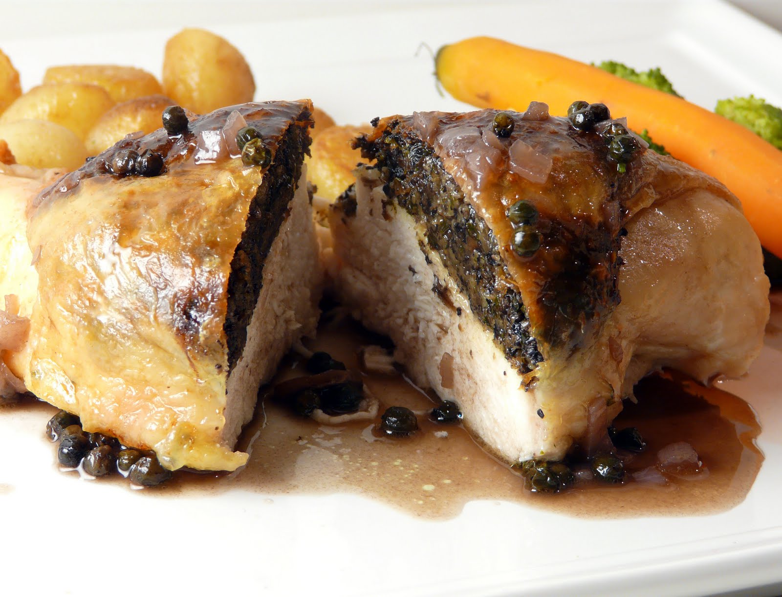 4.Divide the filling in six portions. with your fingertips, make a pocket between the skin and the flesh of each chicken breast. Stuff the filling under the skin of the chicken breasts. Season the breasts with salt and pepper and place in a buttered baking dish large enough to hold the breasts in one layer.