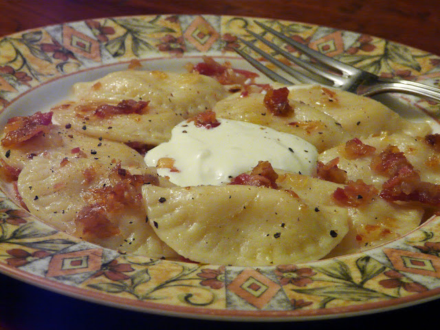 Toss the cooked perogies with some fried onions and bacon or side pork (pork belly) and serve with sour cream.