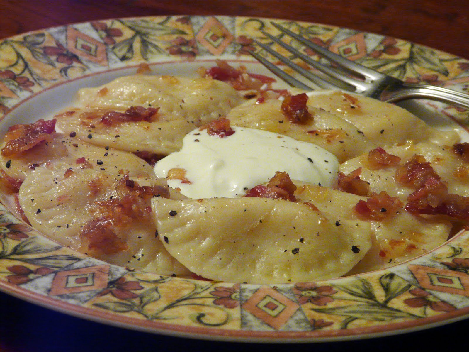 Toss the cooked perogies with some fried onions and bacon or side pork (pork belly) and serve with sour cream.