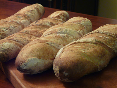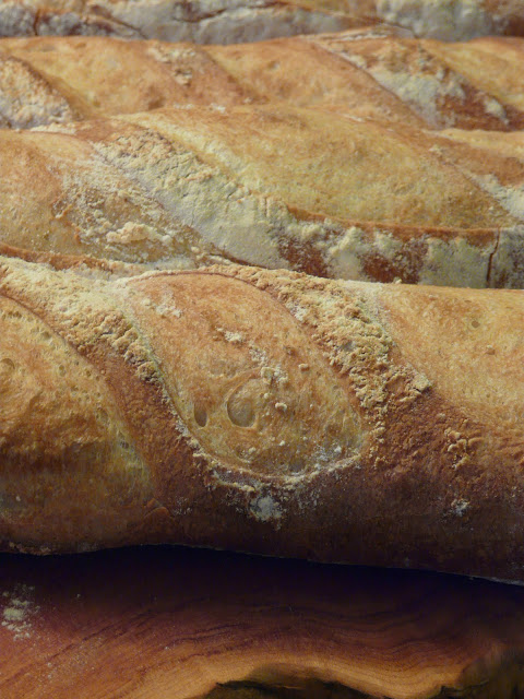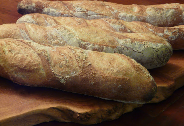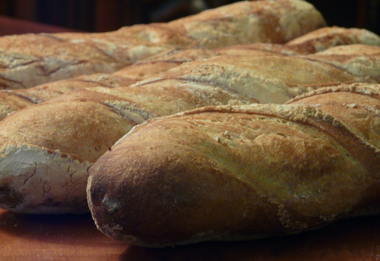 I baked six loaves. Four Baguettes and two larger loaves. There are only four in the photos because I gave one away and we cut into one while it was still warm.