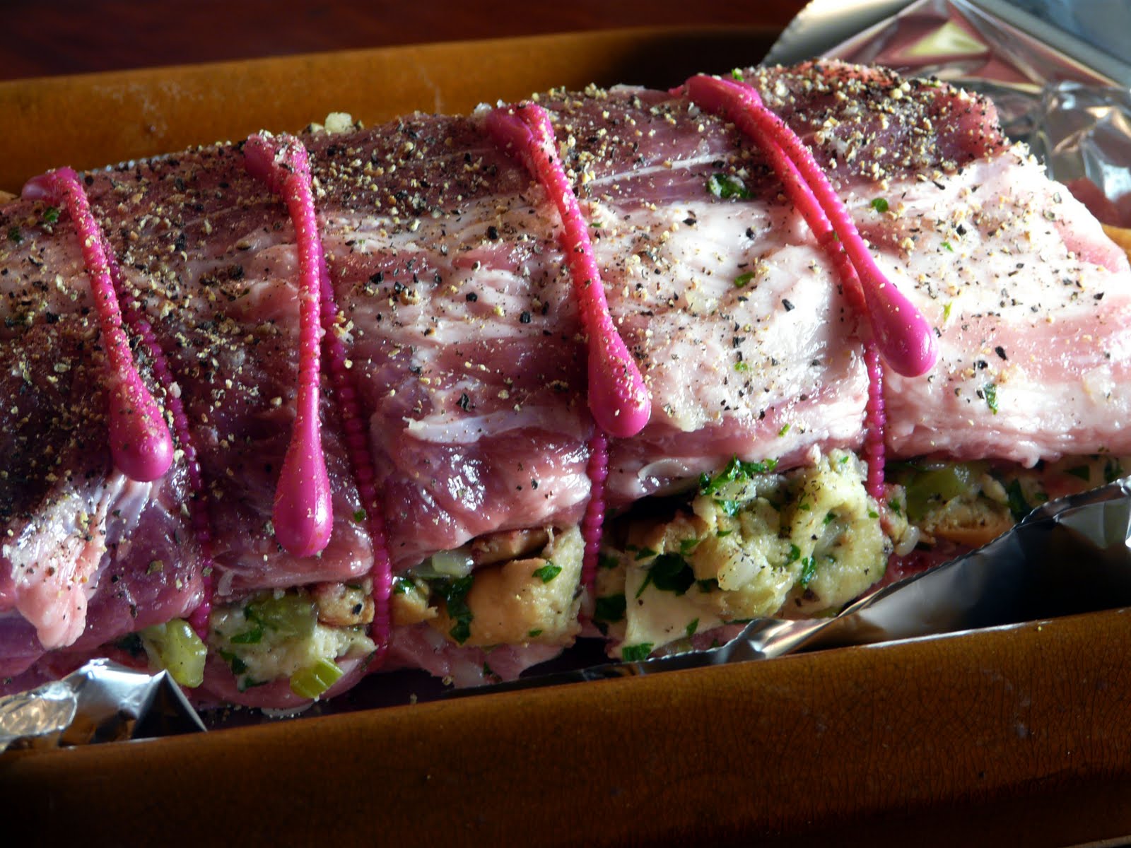 Spread stuffing over one of the racks and top with the second one. Tie together using butcher twine or silicone ties. Place in shallow roasting pan, rub or drizzle with a little olive oil, toss in a few