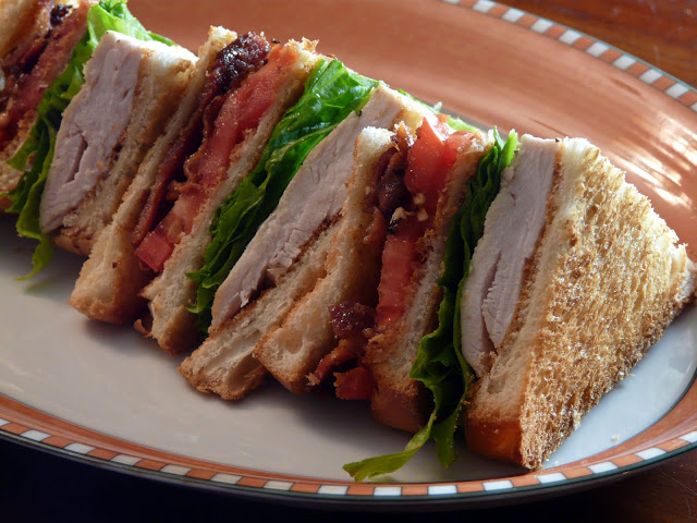 I roasted a small chicken Sunday morning before leaving for work thinking I would make a hot chicken sandwich for dinner. Instead I ended up making a Toasted Clubhouse Sandwich.