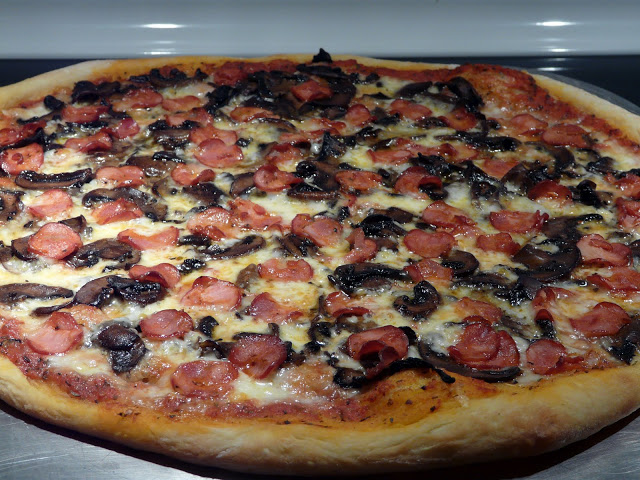 Thin crust Pizza topped with my own pizza sauce, fresh mozzarella, sauted mushrooms and chorizo.