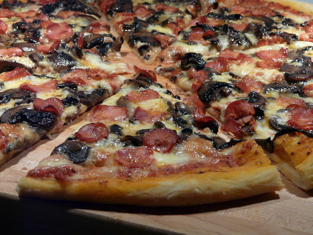 I kneaded up a large batch of bread dough on Tuesday morning. Baked four baguettes on Wednesday and saved half the dough to make pizza and two more loaves of bread Thursday night. Moe took the dough of the fridge an hour or so before I got home from work so that it could come to room temperature.