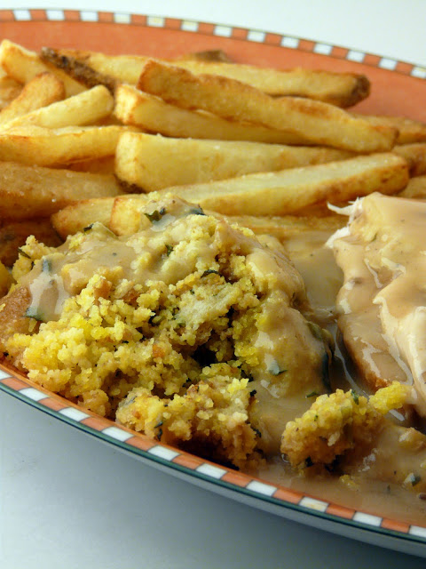 Homemade fries and canned peas. What I call diner food. Normally I wouldn’t serve leftover stuffing/dressing with a hot sandwich but my stuffing was so good (if I do say so myself).