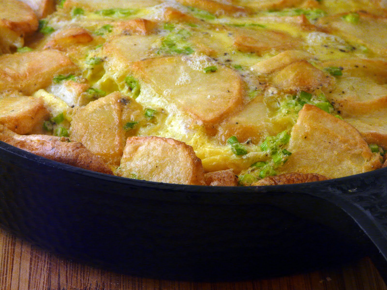 Beat up eggs and season with salt and pepper. Gently toss the potato mixture into eggs. Pour mixture into the two heated cake pans.