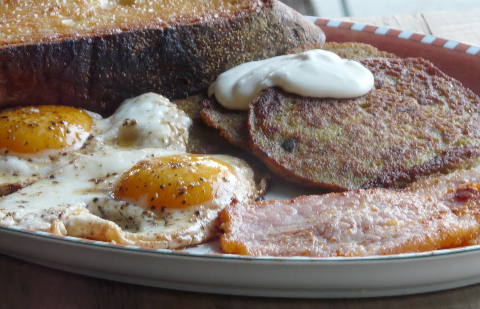 Ann, your breakfast looks fantastic! I just love potato pancakes, eggs and bacon. I know there had to be a leftover brownie or something for dessert 🙂