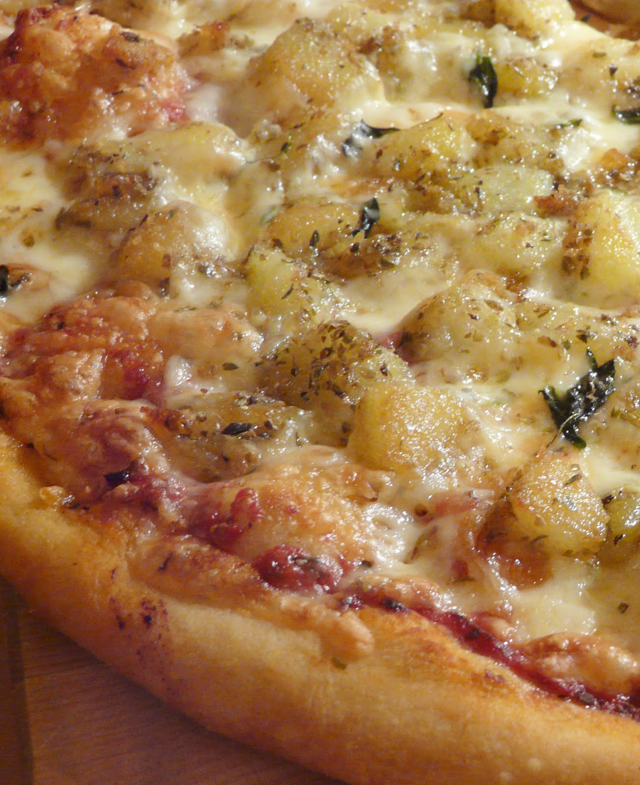 The pizza is topped with my pizza sauce, mozzarella and little roasted potato cubes that are seasoned with fresh garlic and lots of oregano and a squeeze of fresh lemon.