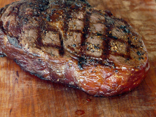 I presalted a nice thick Rib Eye steak on Tuesday with the intentions of grilling it for dinner Thursday or Friday. That didn’t happen. So I grilled it this morning for Moe’s breakfast.