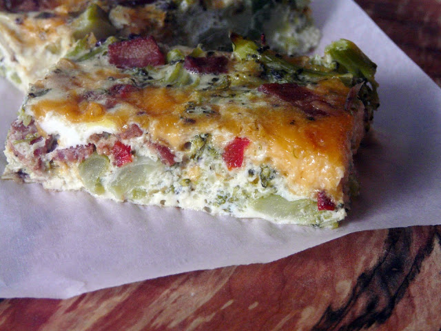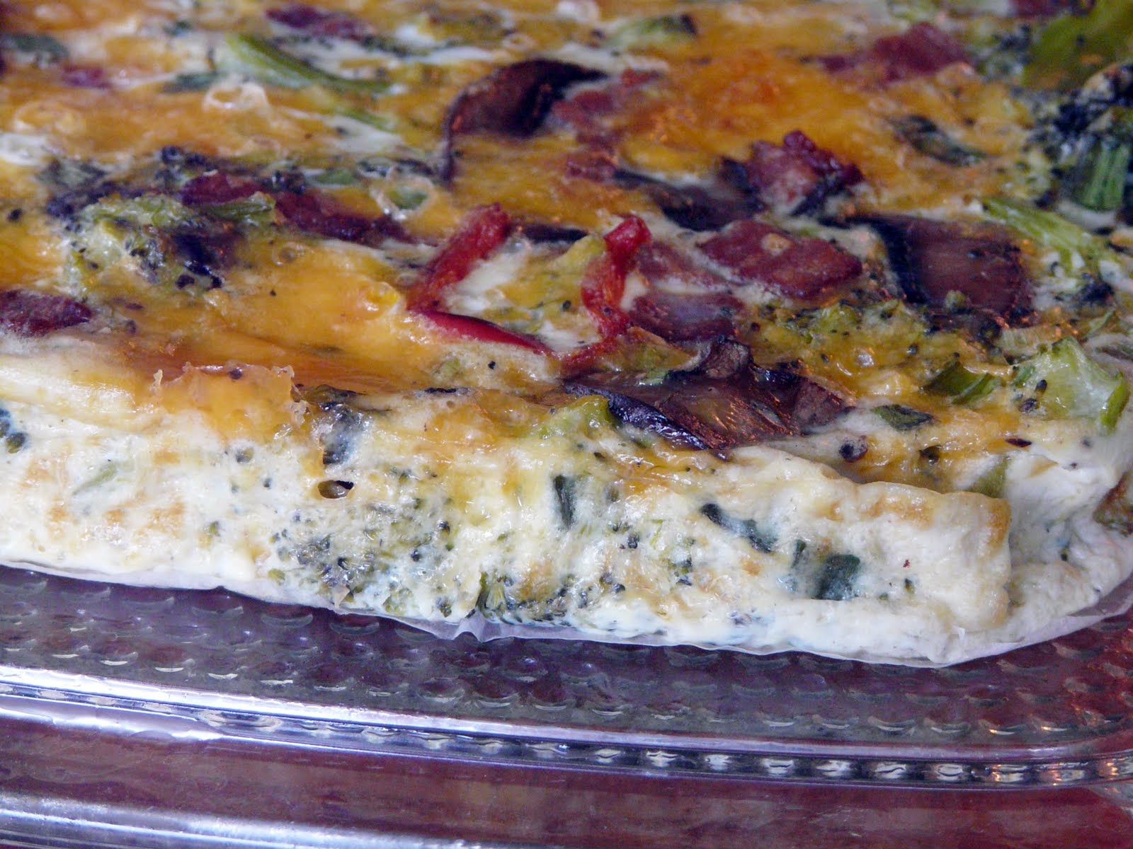 I did make a few adjustments, adding bacon and mushrooms to the mix. I steamed the broccoli and set it aside while the bacon fried. The mushrooms were sliced and sauted in the bacon fat, and,then the red pepper strips were added to the same pan and quickly sauted. The cheddar cheese I used was not low-fat. And I baked it in a buttered square spring-form pan that was lined with buttered parchment paper.
