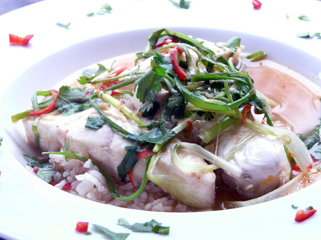 Just before serving, the fish was topped with some green onions cut into long strips, julienned ginger, cilantro, and a small red chili pepper also julienned. Served in shallow pasta bowls over steamed jasmine rice. I loved the combination of flavours and expect this meal to be on the menu often during halibut season.
