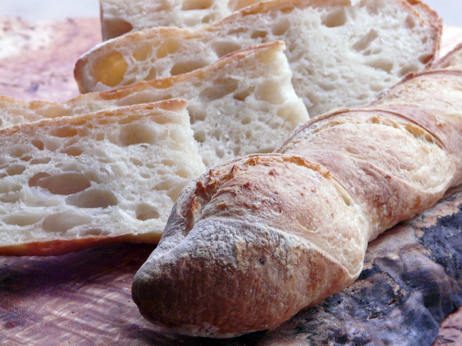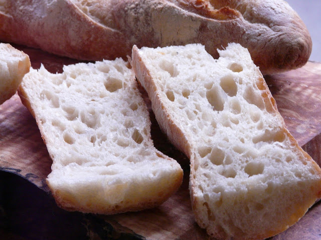 I’m still baking bread at least once a week. Last Tuesday I kneaded up a batch of baguette dough, baked four small baguettes and saved the other half for another day. Which turned out to be Sunday. Moe pulled the dough out of the fridge early so that it was at room temperature by the time I got home from work.