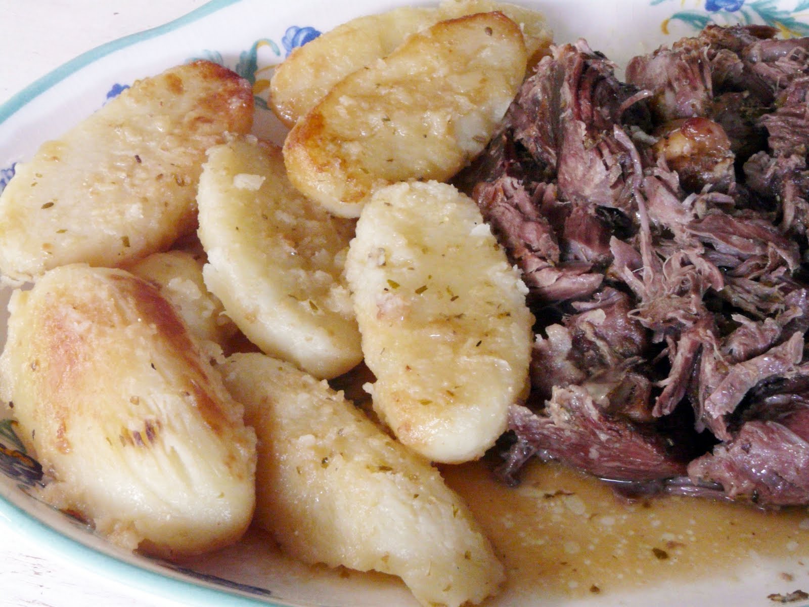 The potatoes were par boiled just long enough to cook the outer layer, then drained and put back in the pan and shaken to rough up the surface. Then roasted in a cast iron skillet with a little olive oil, in a hot oven, turing a few times to brown. When the potatoes were tender, I added a little of the liquid from the lamb and the juice of a lemon. Covered the potatoes and put them back into a low oven to stay warm.