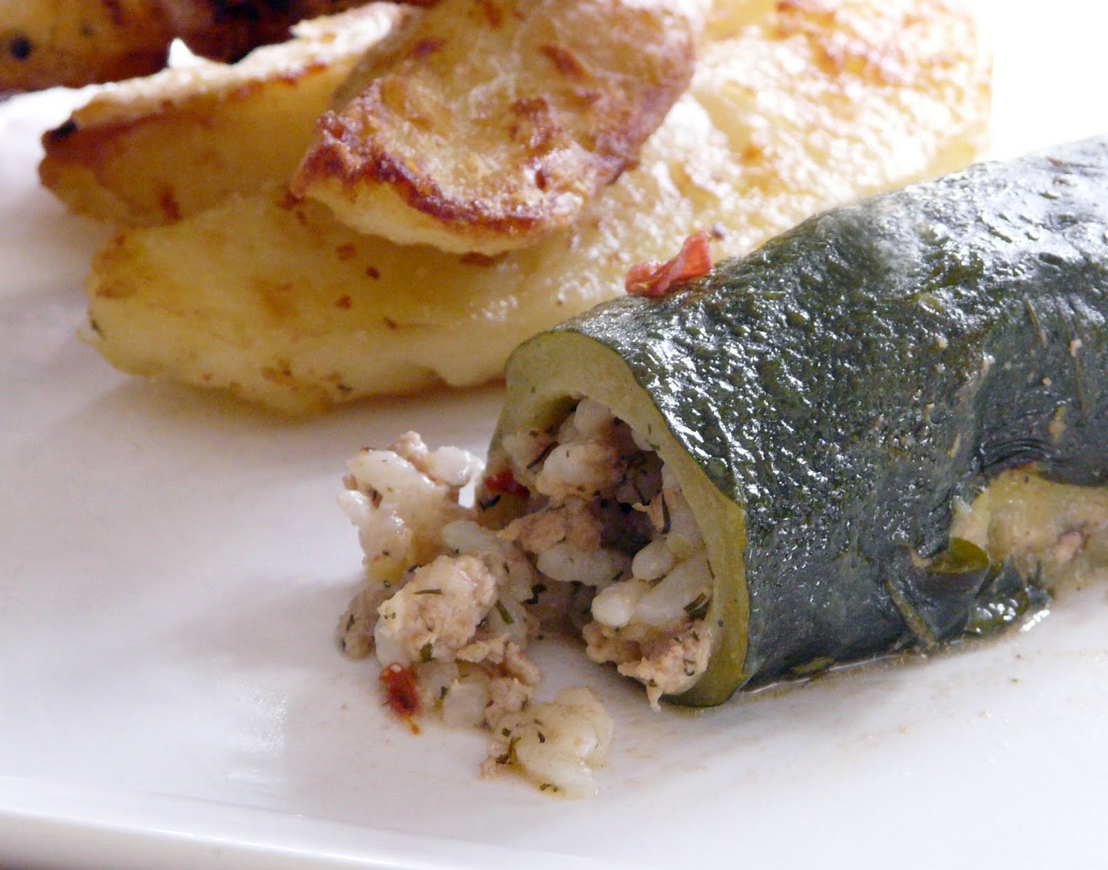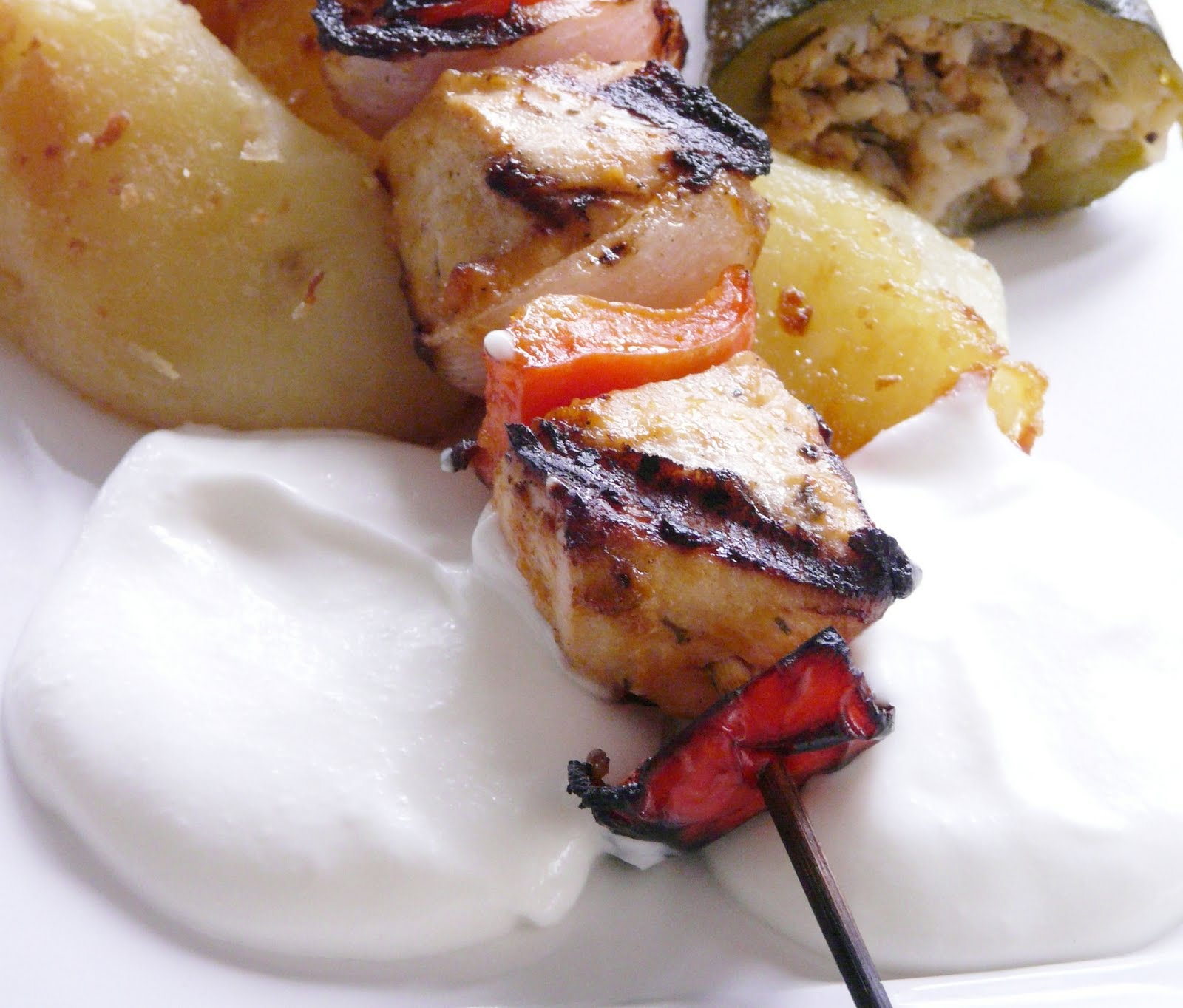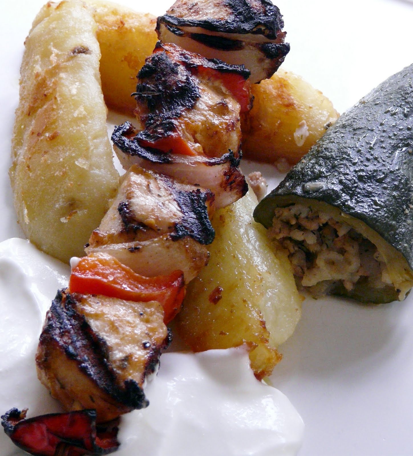 Chicho also had a recipe for stuffed zucchini on her blog. Although I didn’t use her recipe it gave me the idea to make something similar. Mine was stuffed with a ground pork and rice mixture that I seasoned with onions, garlic, fresh dill, parsley, lemon zest, the inside of the zucchini, chopped tomato, salt/pepper and chicken broth. The stuffed zucchini and roasted lemon potatoes were both served along side the kabobs.
