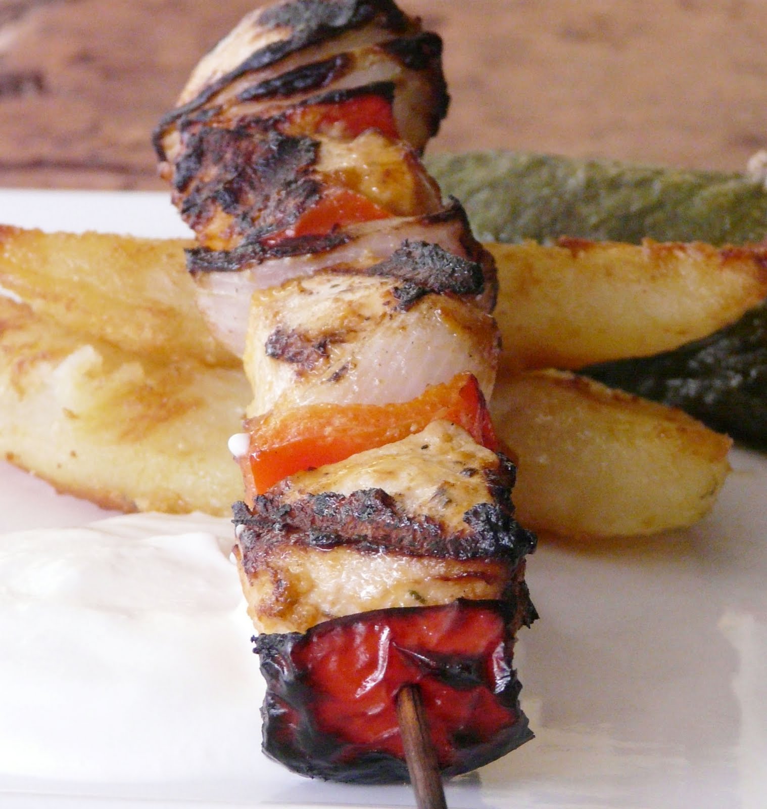 I marinaded the chicken all day and made the sauce early so the garlic would have time to mellow out. My skewers were chicken, red pepper and onion. TIP: Par Boil onions and red peppers for 30 to 60 seconds. Drain and run under cold water. This softens the vegetables just enough to make them easier to skewer.