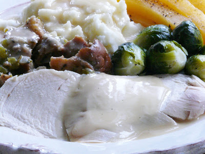 Served with mashed potatoes and gravy, Brussels sprouts and rutabaga.