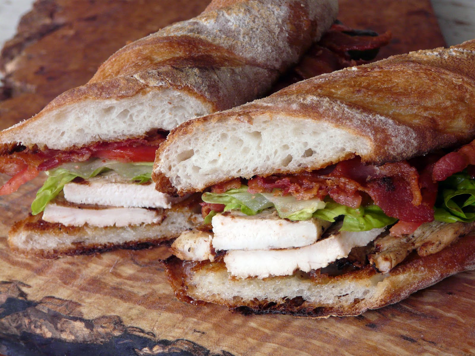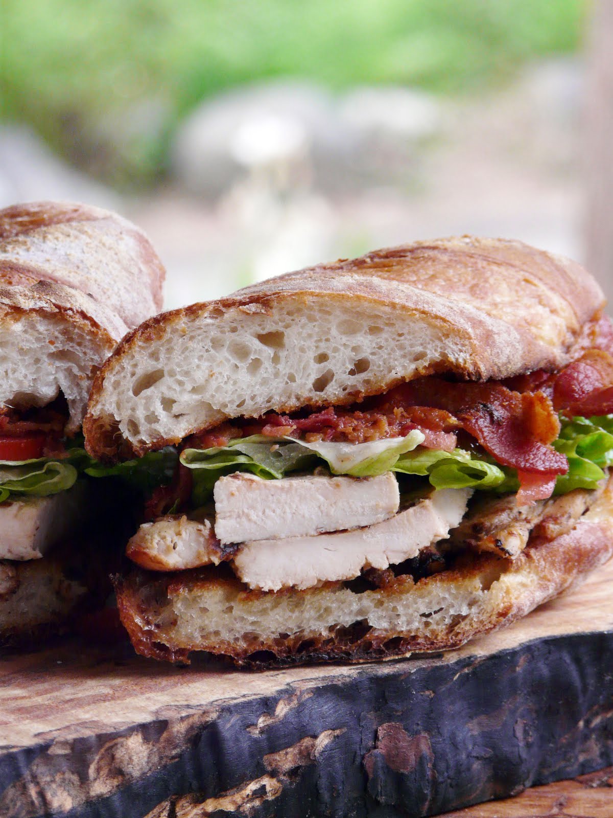 I grilled a couple of extra boneless chicken breasts when I made dinner last night. Used them today to make club house sandwiches for brunch. Toasted a homemade baguette and topped with the chicken breasts, bacon, lettuce and tomatoes.