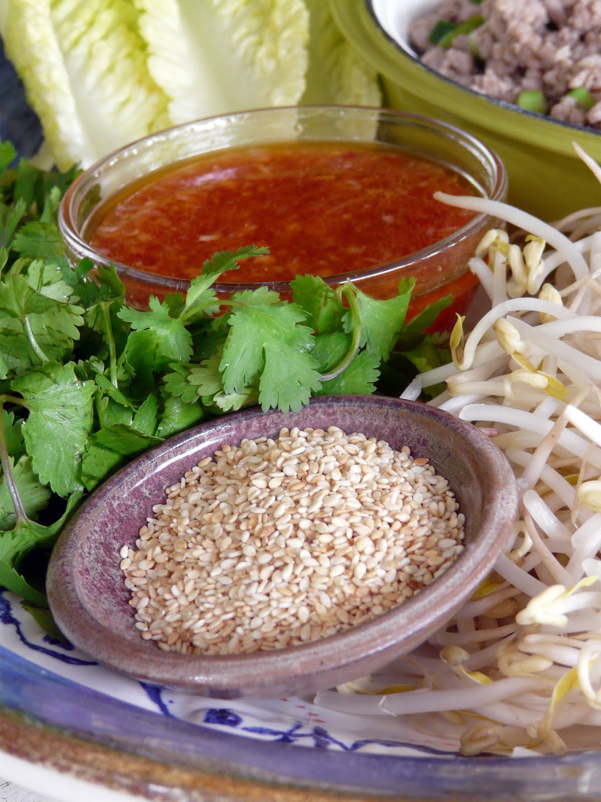 To serve, spoon on to lettuce leaves and drizzle on a little of the sauce. Top with bean sprouts and cilantro.