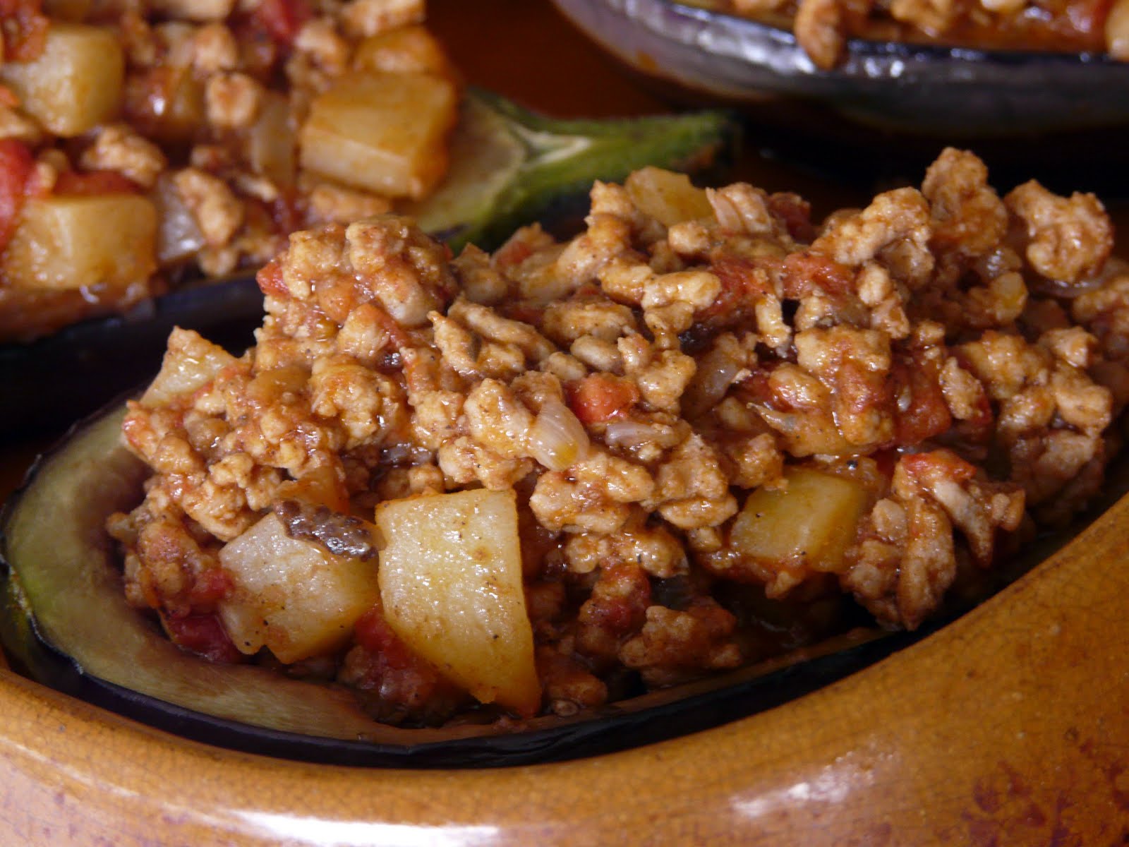Cut the eggplants in half. Heated a little olive oil in a skillet. Browned all sides of the eggplant and set aside until cool enough to handle. Hollowed out eggplant halves being careful to avoid cutting through the skin.