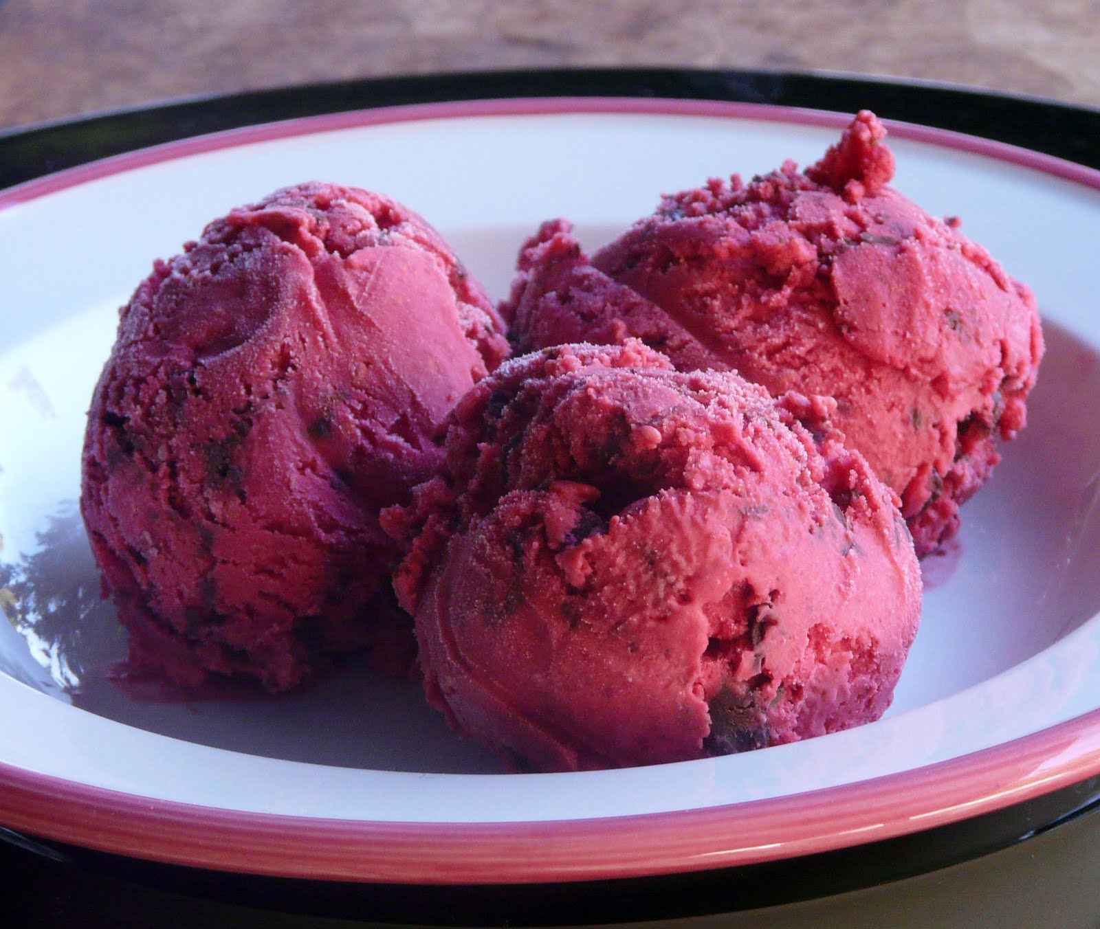 Using the same Five Minute – Three Ingredient Ice Cream recipe – this time with frozen raspberries.