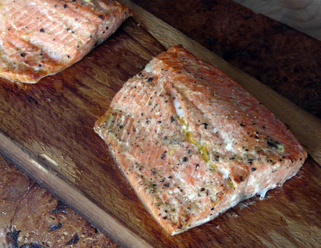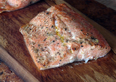 I boned out the salmon for two nice size fillets. The fish was rubbed with a mixture of fresh garlic, olive oil and lemon juice, salt and pepper and left in the fridge for about 30 minutes. Any longer and the lemon would have started to cook the fish.