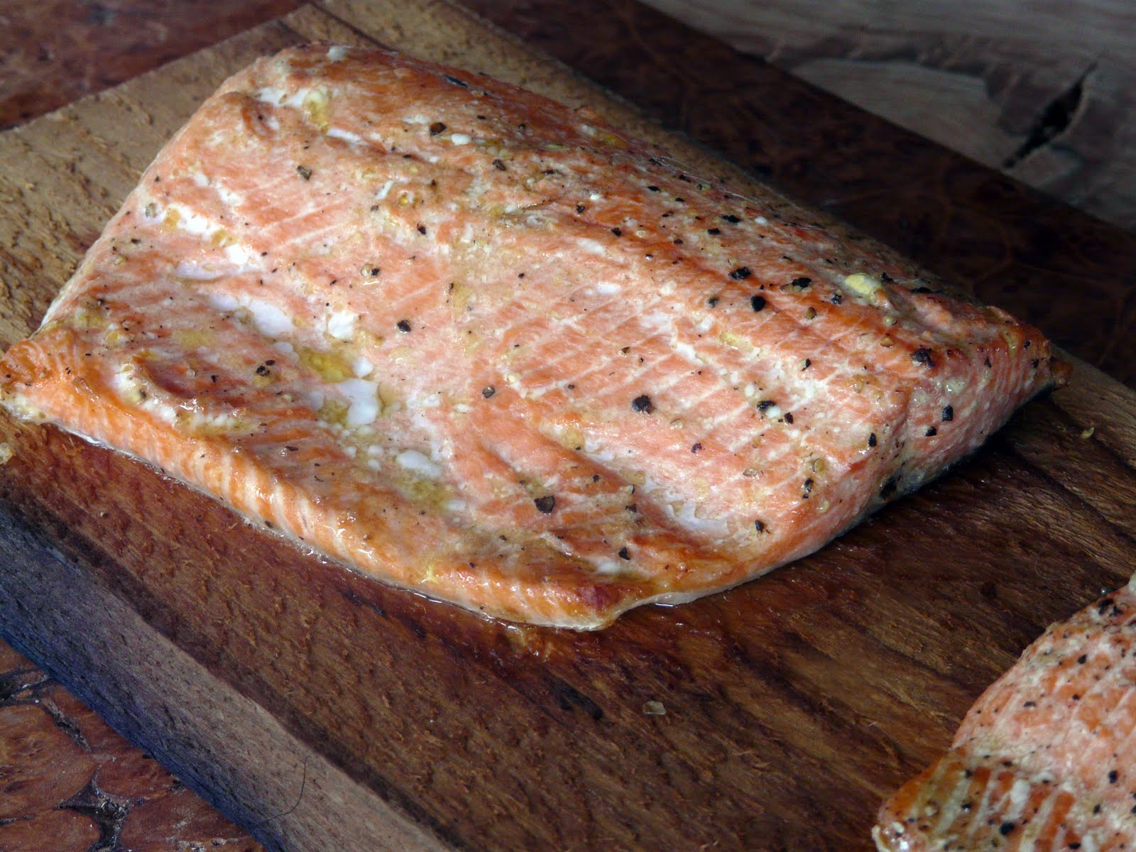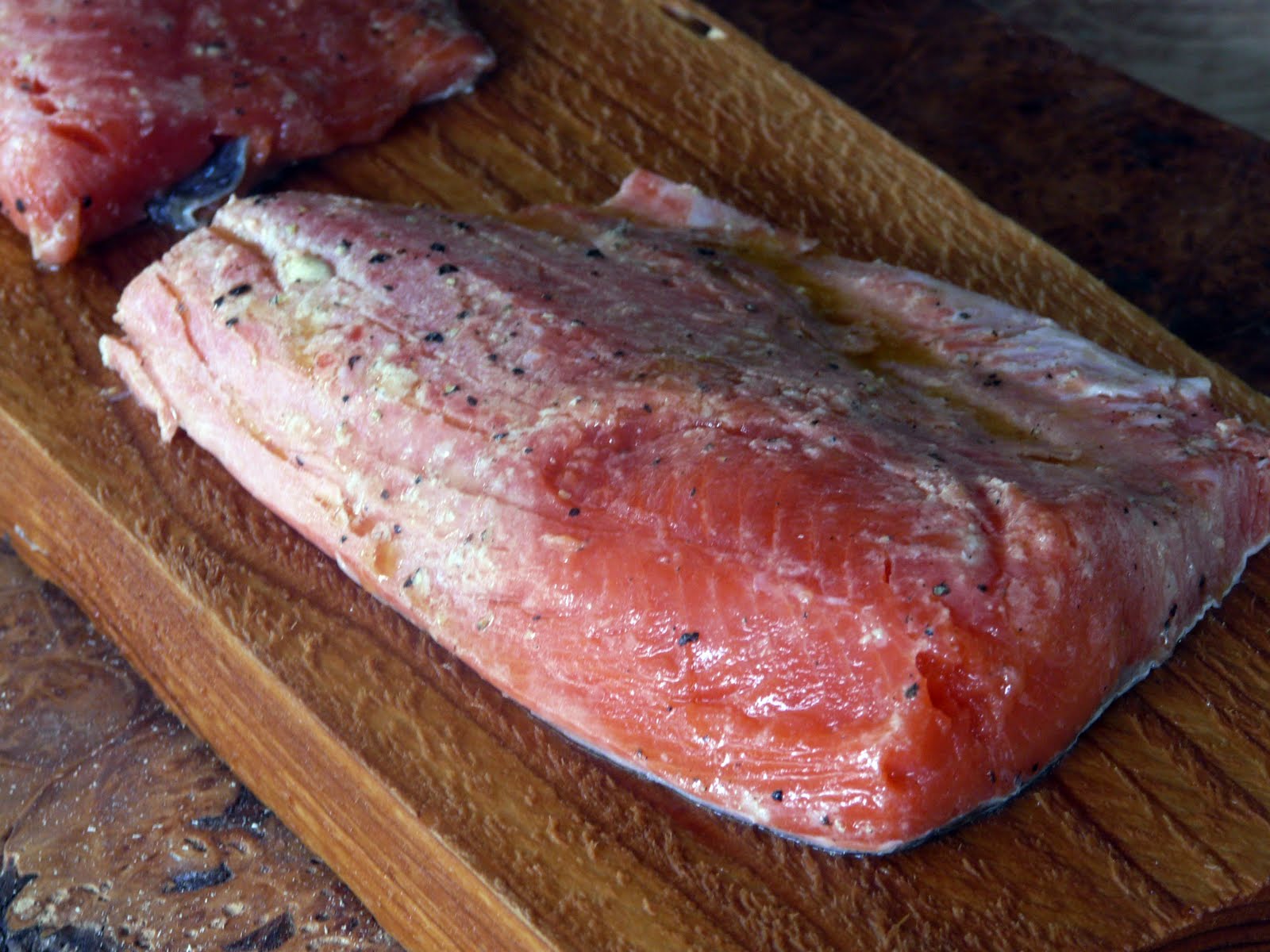I boned out the salmon for two nice size fillets. The fish was rubbed with a mixture of fresh garlic, olive oil and lemon juice, salt and pepper and left in the fridge for about 30 minutes. Any longer and the lemon would have started to cook the fish.
