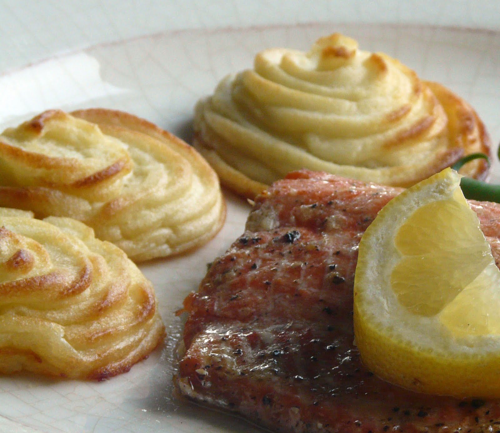 I am hopelessly behind in reading food blogs. I'm spending a lazy Sunday trying to catch up on hundreds of recipes! I am anxious to try planked salmon. But, the Duchess potatoes… so pretty. Um, how'd you make them?