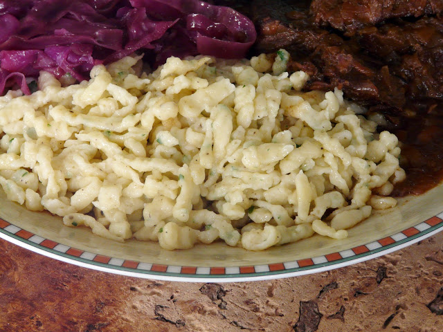 WE eat goulash and its relatives all the time, ignoring the thermostat. Your version looks delicious and inviting. But, I'll have to pick my favorite, the spaetzle. I wish I could crawl through the screen and steel the whole pile!My Serbian mother makes the dish the way Anonymous described it. But she will not hear me here, and I can confess I brown the meat dredged in flour first, and then add the onions, like you did. Greetings from California.