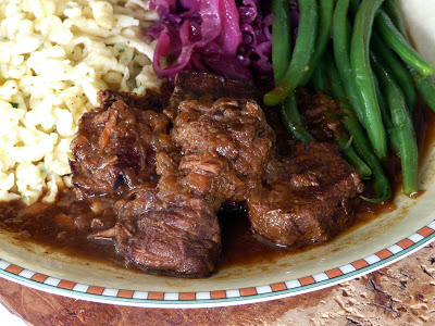 WE eat goulash and its relatives all the time, ignoring the thermostat. Your version looks delicious and inviting. But, I'll have to pick my favorite, the spaetzle. I wish I could crawl through the screen and steel the whole pile!My Serbian mother makes the dish the way Anonymous described it. But she will not hear me here, and I can confess I brown the meat dredged in flour first, and then add the onions, like you did. Greetings from California.