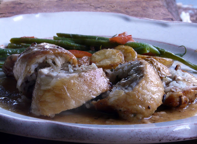 I bought three small chickens with the intention of freezing two of them and roasting the other one for dinner. Instead I decided to cut them up. Three whole breasts with wings attached packaged separately and a package with four legs went into the freezer and the two remaining legs were boned and stuffed for tonight’s dinner.