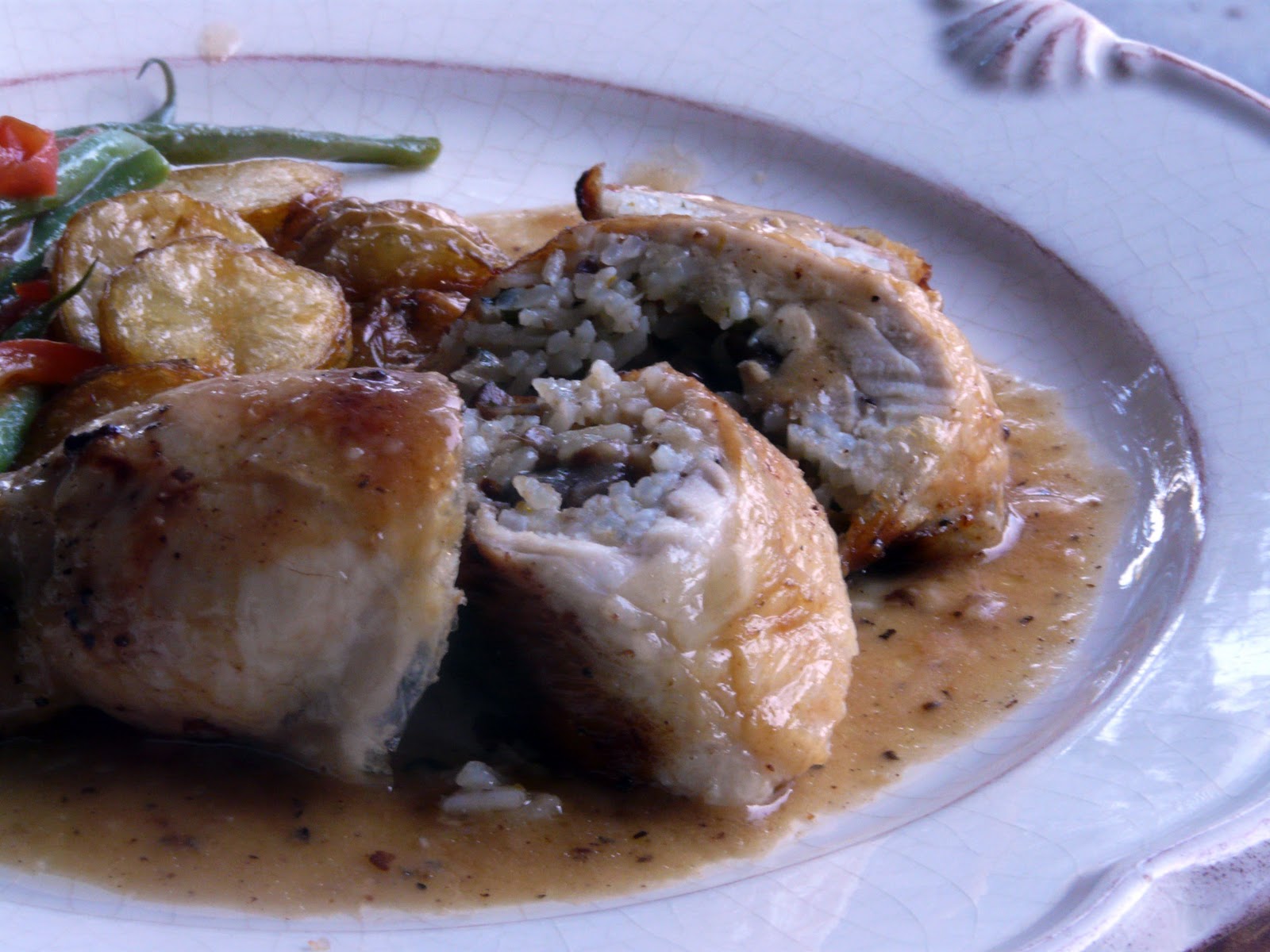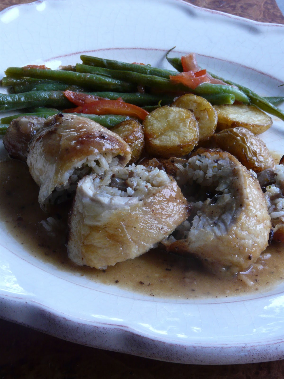 I bought three small chickens with the intention of freezing two of them and roasting the other one for dinner. Instead I decided to cut them up. Three whole breasts with wings attached packaged separately and a package with four legs went into the freezer and the two remaining legs were boned and stuffed for tonight’s dinner.