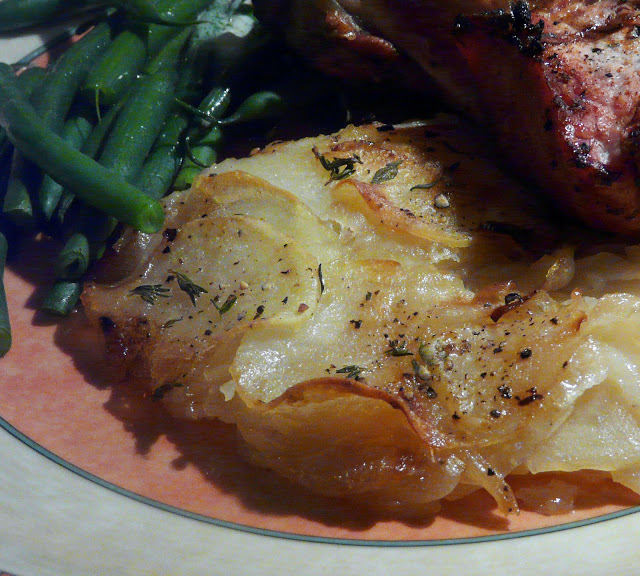 Basically a potato gratin made thinly sliced russet potatoes, sliced onions fried in olive oil, chicken broth, salt, pepper and fresh thyme. Baked in a 425°F oven until tender.