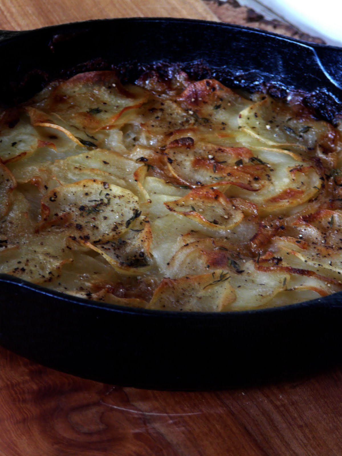 Basically a potato gratin made thinly sliced russet potatoes, sliced onions fried in olive oil, chicken broth, salt, pepper and fresh thyme. Baked in a 425°F oven until tender.