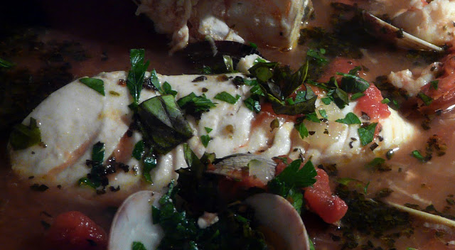 Add seafood in the order that it takes too cook. I added the crab first because it needed about an 8 minute head start. Next I added the halibut, clams and prawns. Removed from the heat and add chopped Italian Parsley and chopped basil.
