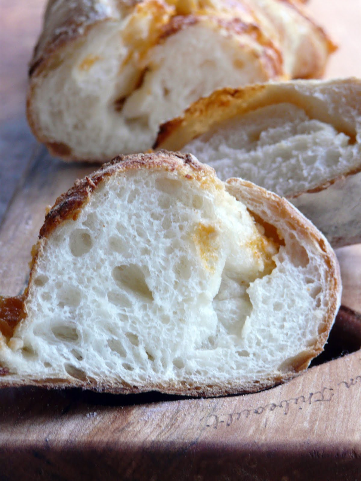 Two plain baguettes and one large filled with cheddar and roasted garlic. The other half will probably get baked on Wednesday. Or maybe I’ll make a pizza.