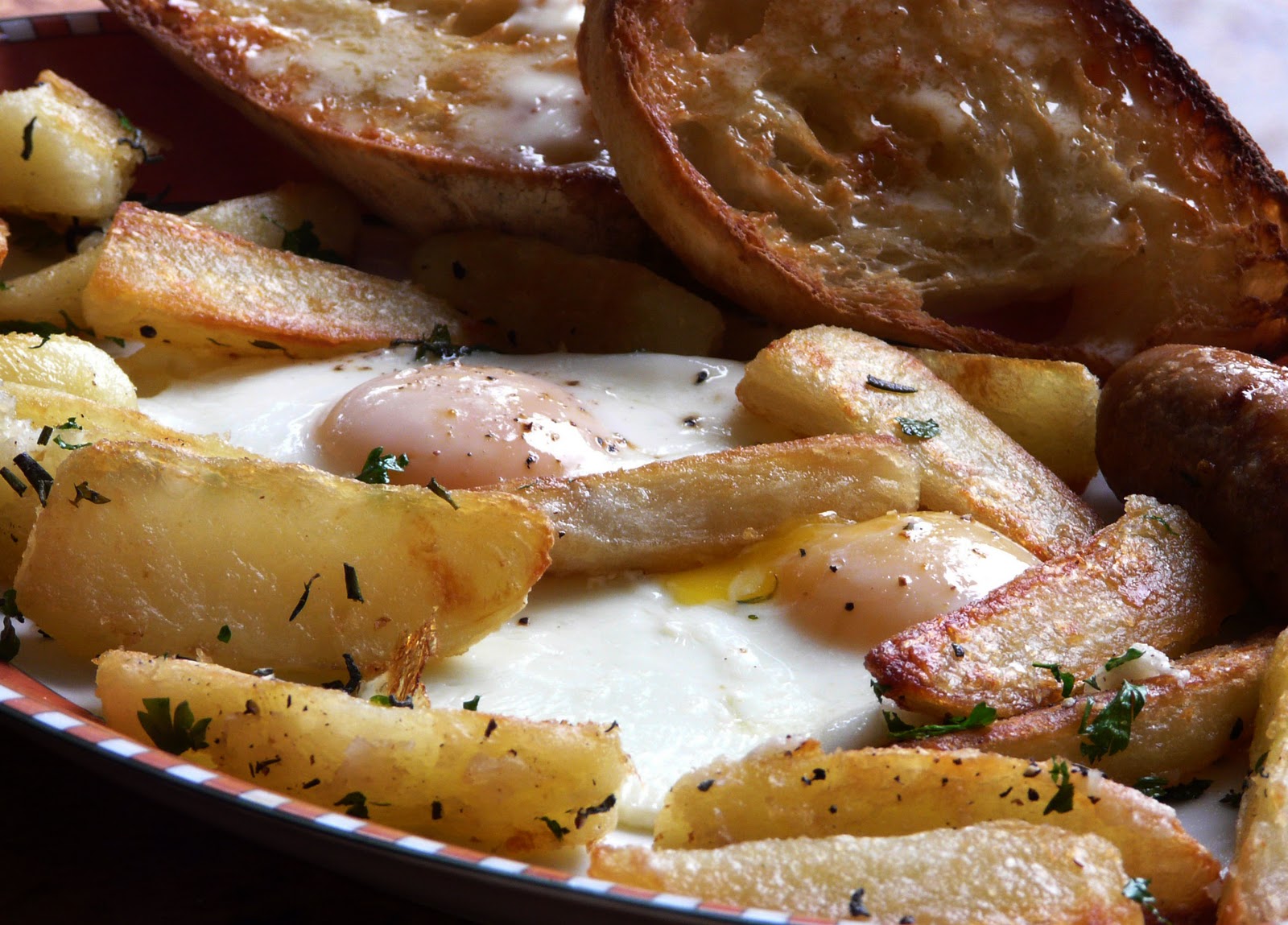 When potatoes are tender and golden, sprinkle with minced garlic and fresh chopped herbs. Push potatoes to one end of the cookie sheet. Add a little butter to the other end of the sheet, add the eggs, sprinkle with salt and pepper and return to the oven. Remove when eggs are cooked. Doesn’t take long, just 4 or 5 minutes.