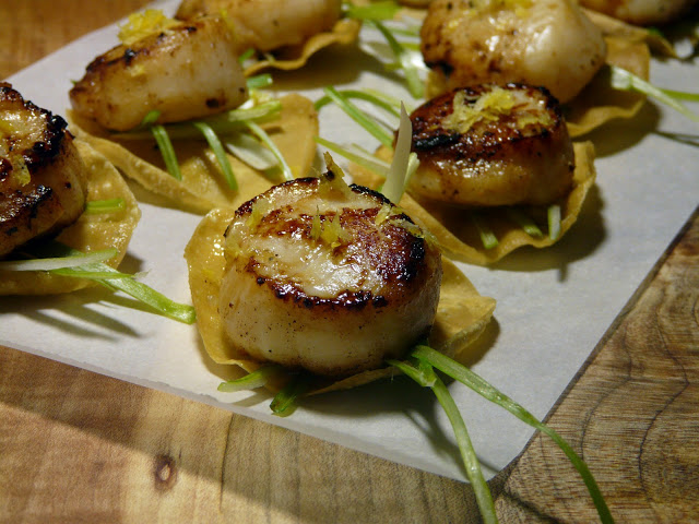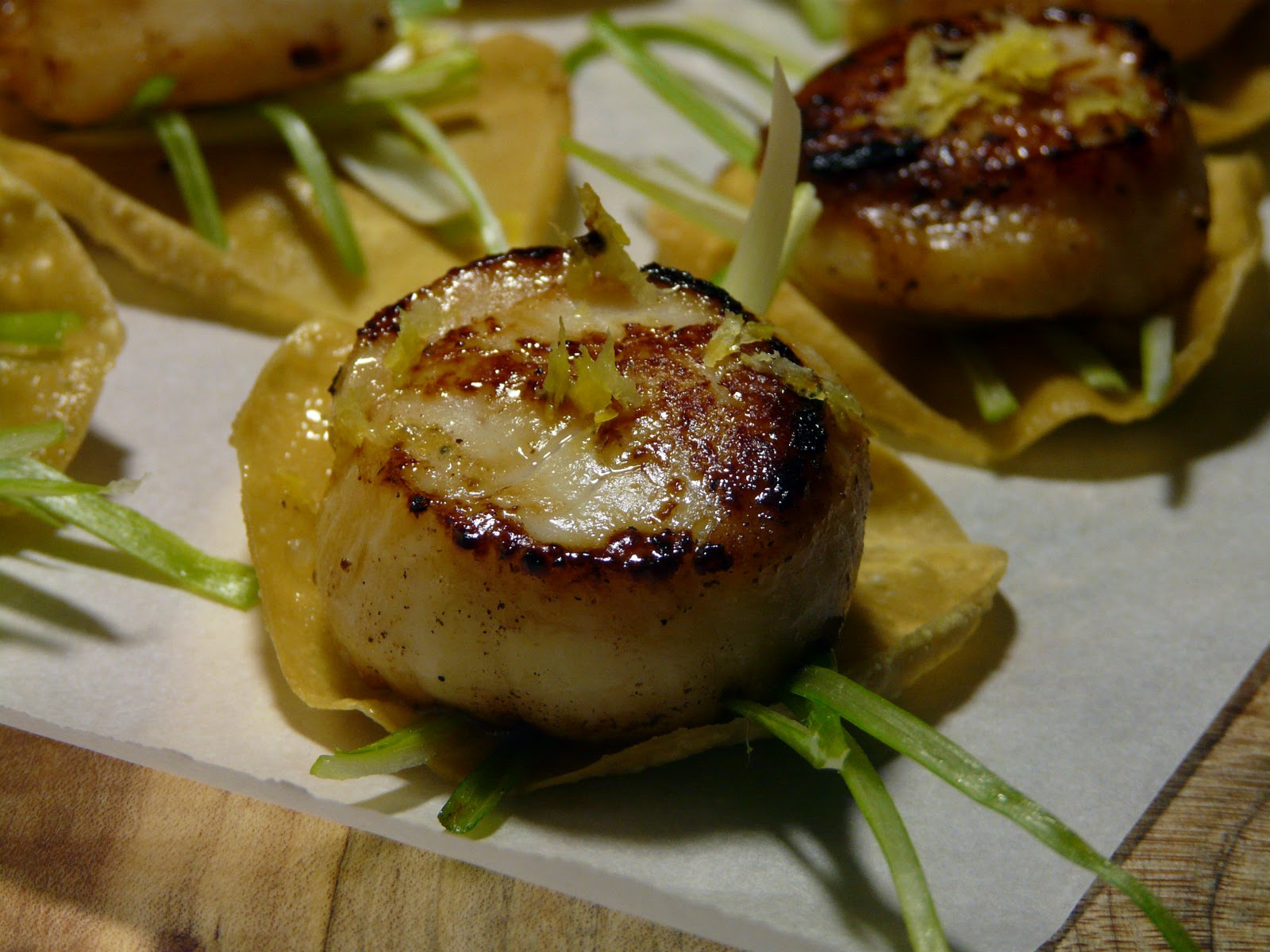 Place one scallop on each prepared wonton; spoon a little of the pan juices over each scallop, garnish with finely grated lemon zest (use your microplane!)