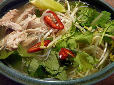 To serve, heat broth to boiling and add noodles. Add chicken, . Serve with garnishes on the side. Each person can add garnishes to suit own taste.