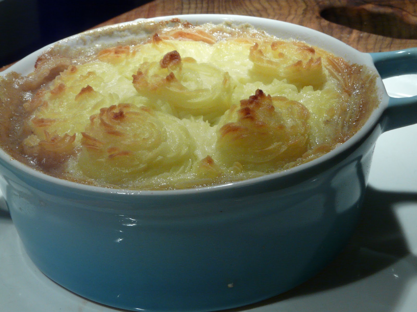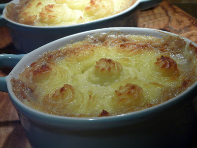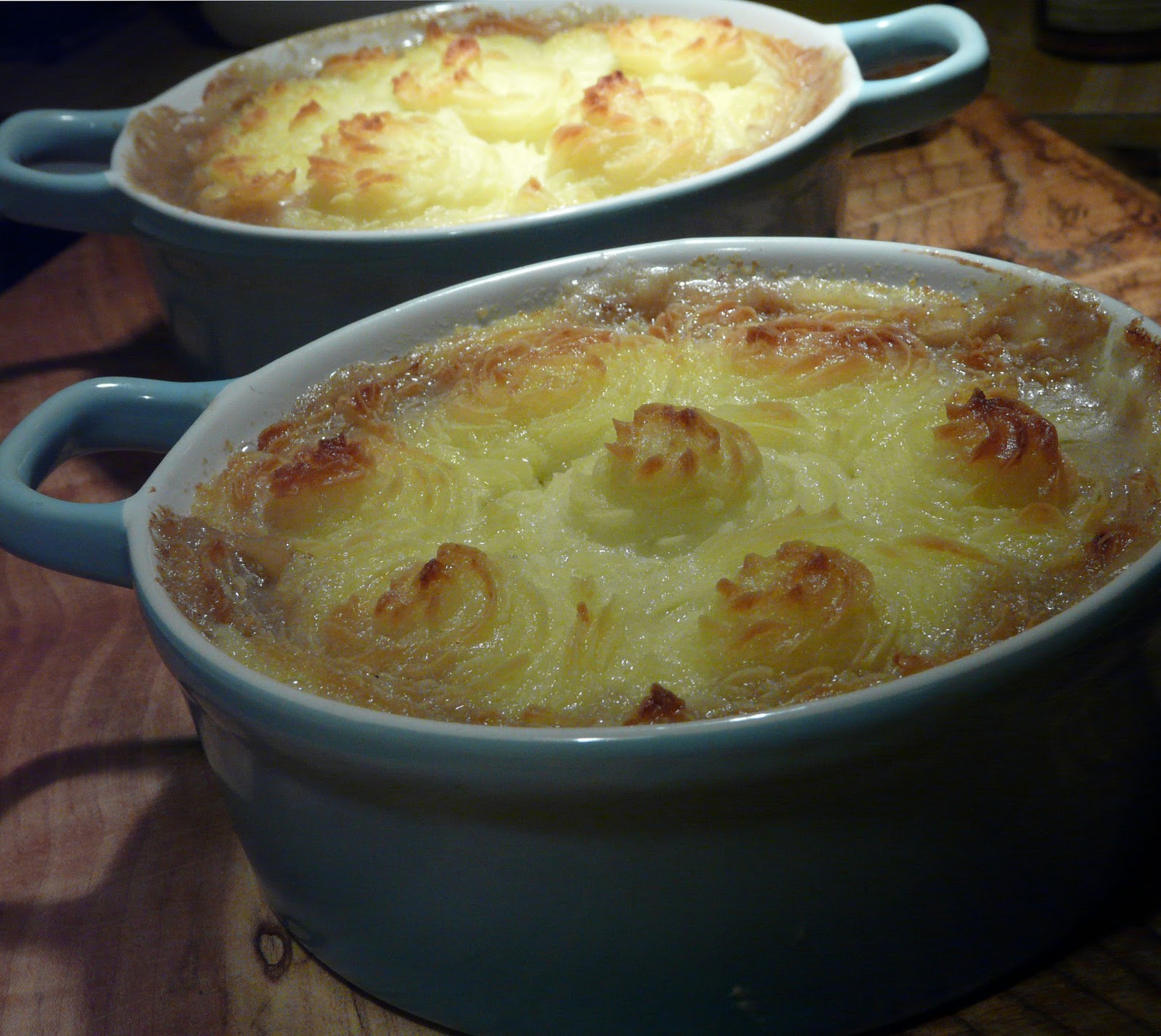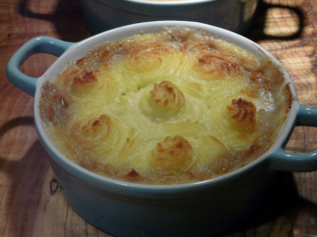 Dear Ann, that is exactly how I made my last Shepherd's pie, with piped mashed potatoes, and its rich sauce oozing through. That was 3 years ago. Why have I not made this since? Funny thing is, Sam and I were just talking about how much she missed this comforting dish. I do too.Maybe it's time for an encore. But I'll need to borrow your pretty casserole dishes.