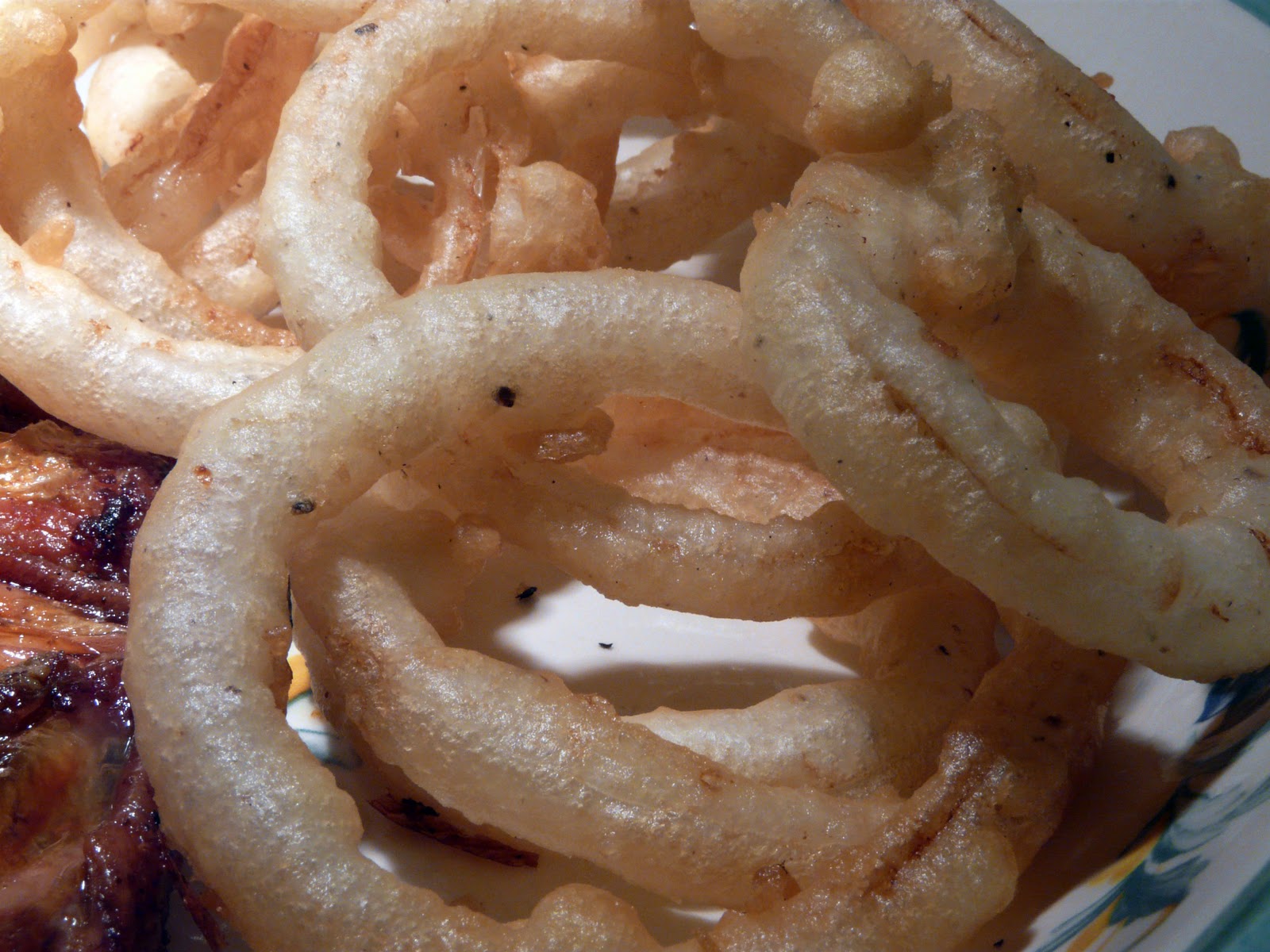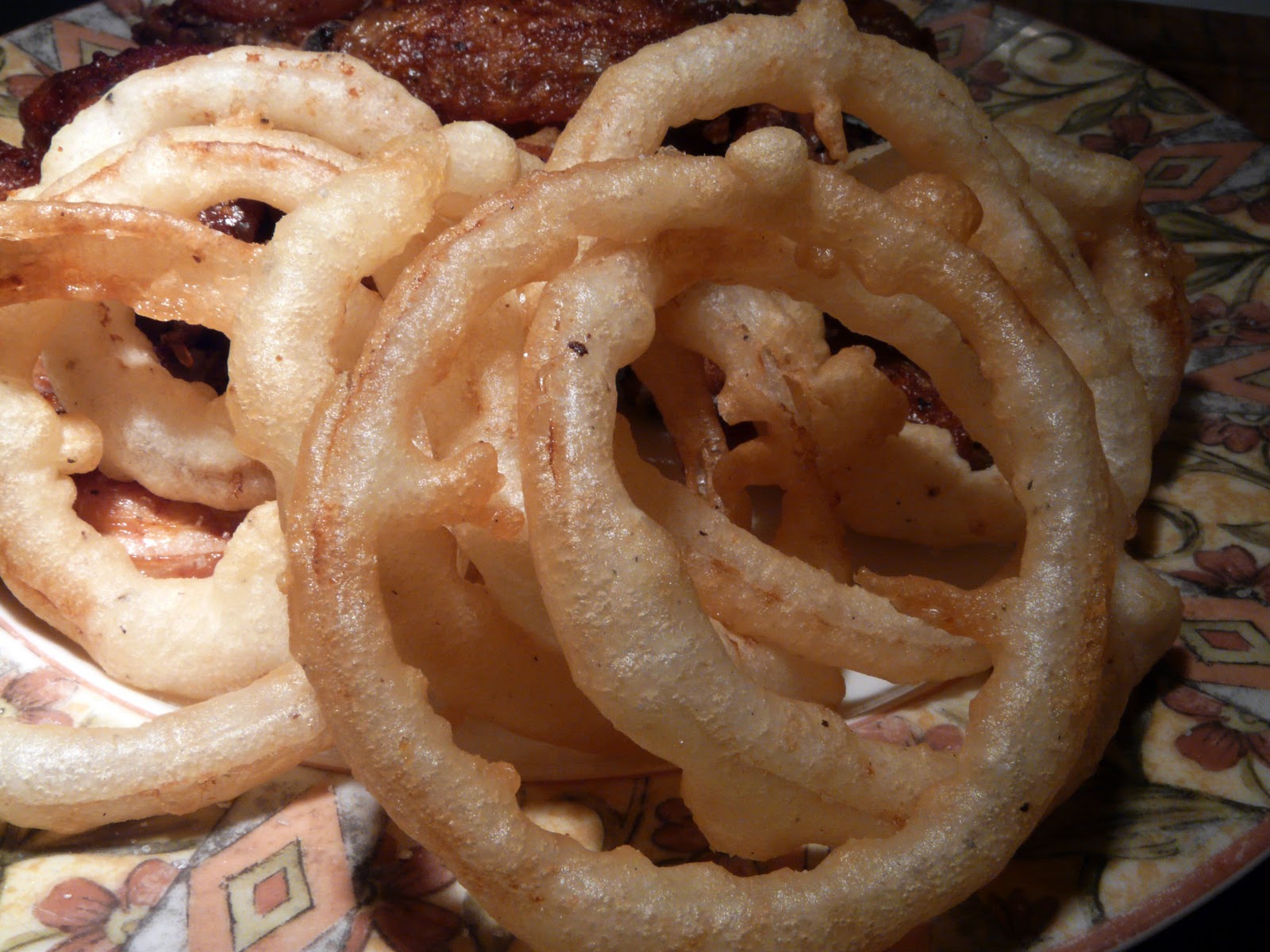 The onion rings were soaked in ice water for 15 or 20 minutes, Dried on paper towels and then dipped in a batter made from a mixture of flour and cornstarch, salt, pepper, a pinch or so of baking powder and enough soda water to make a light batter. Deep fried at 375°F.