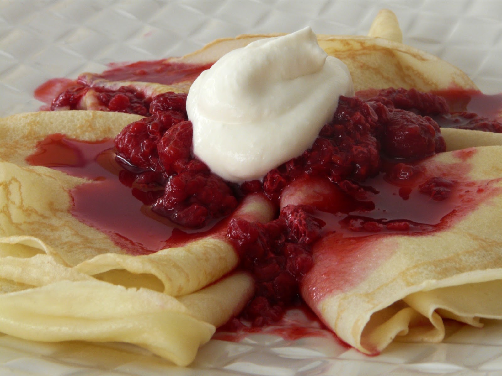 Heat a 6 or 7 inch crepe pan over moderate heat. Film pan with a little butter or oil and add enough batter, to film bottom of pan. It should sputter and form tiny holes as you tilt the pan to cover the bottom. The thinner the better. When golden underneath, turn and cook for just a few seconds.