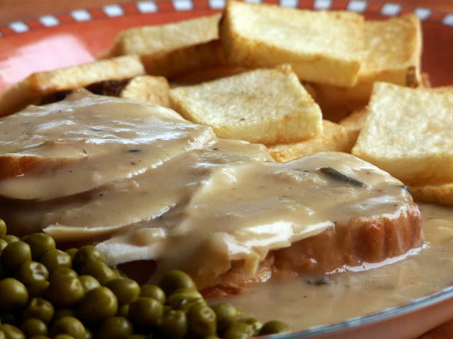 Hot chicken sandwiches with homemade fries and canned peas (sorry).