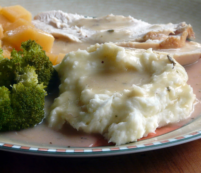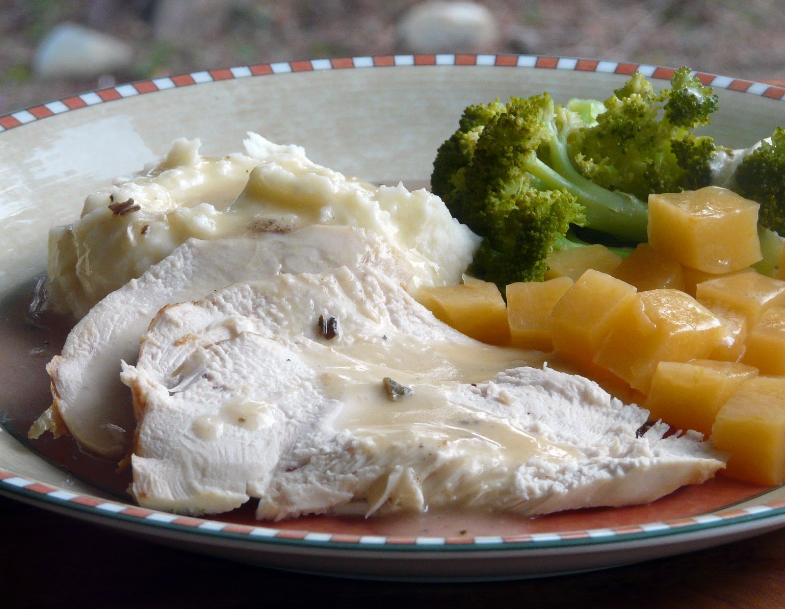 This really is a dinner that does not require a lot actual on-hands time. The chicken only has to be checked once or twice. After 10 or 15 minutes I give the pan a shake to make sure that the bird isn’t sticking. And I might do that again after 30 minutes just to be on the safe side. I set my timer and then I go and do something else. Like check my favourite websites. Potatoes and vegetables take just a few minutes to prep. And again, I can be doing something else while the vegetables cook. Gravy takes a few minutes to make and is left to simmer on low while the chicken rests. You need a few extra minutes in the kitchen to mash the potatoes and carve the meat, but all in all I bet my time in the kitchen for this dinner is less than 20 minutes.