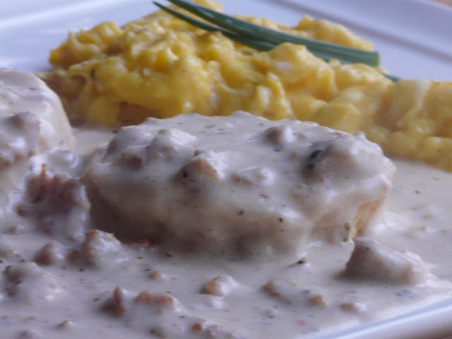 With dish like this you must live in the South (of Canada). The biscuits looked good yesterday, but they look awesome today. You make your gravy just as I do. I haven't had breakfast yet, and I'm instantly hungry.