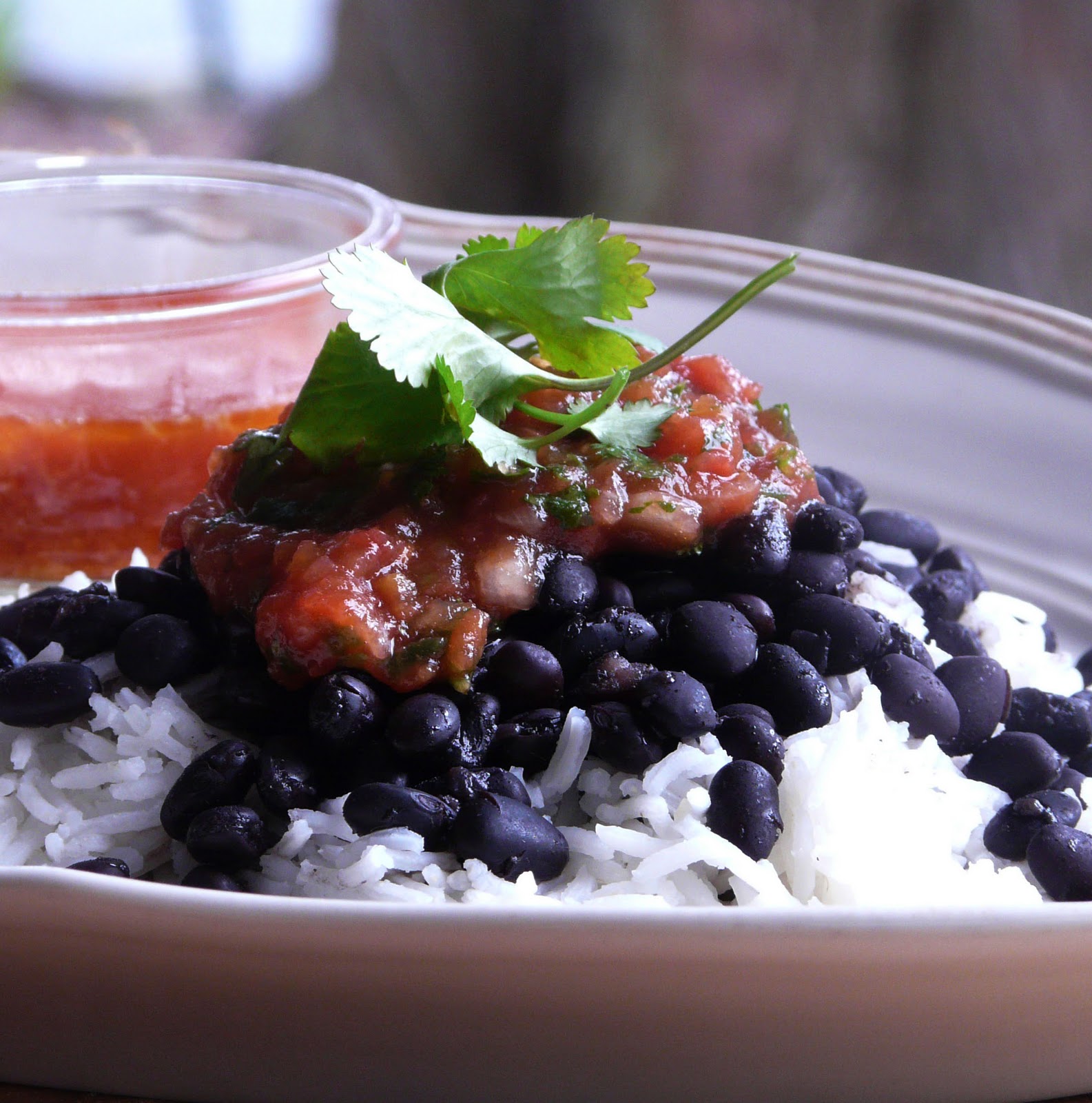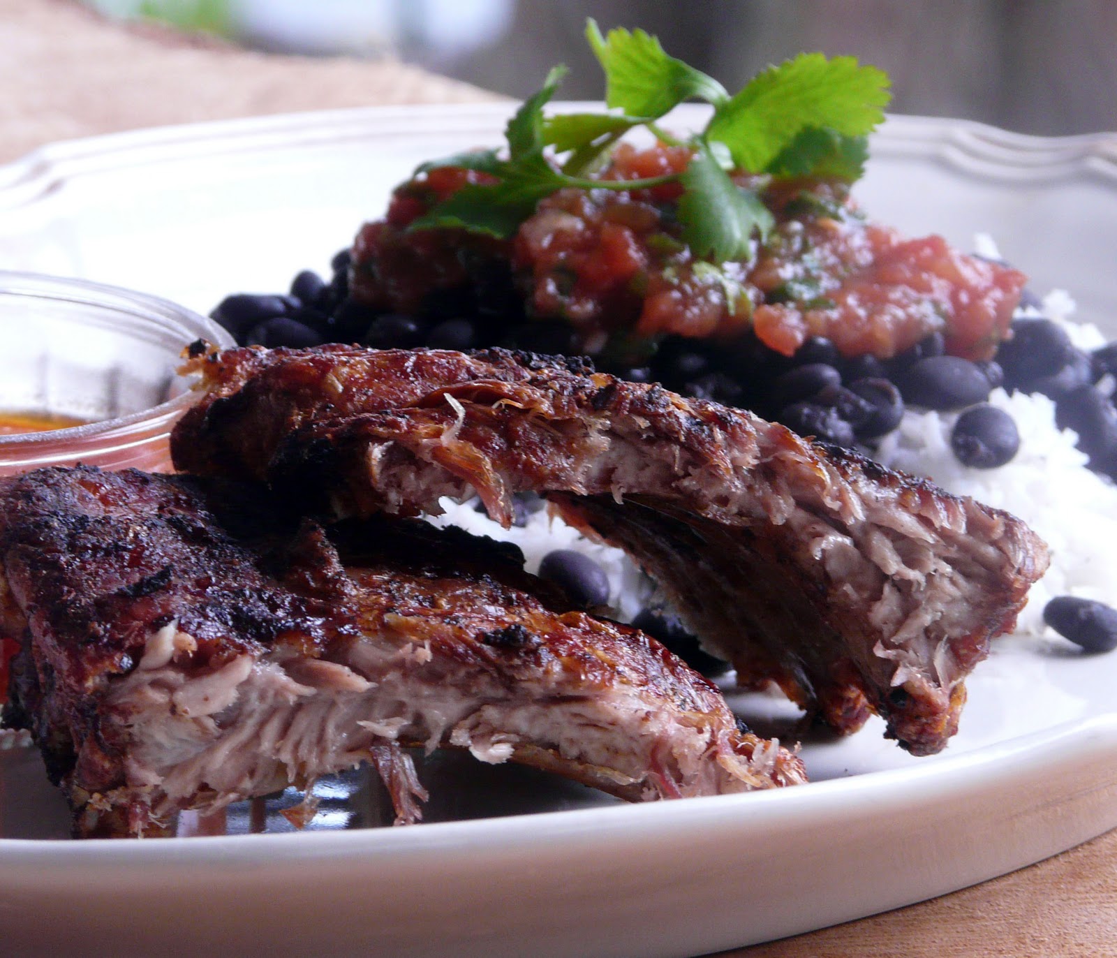 The ribs were grilled and the beans were served over rice topped with the salsa.
