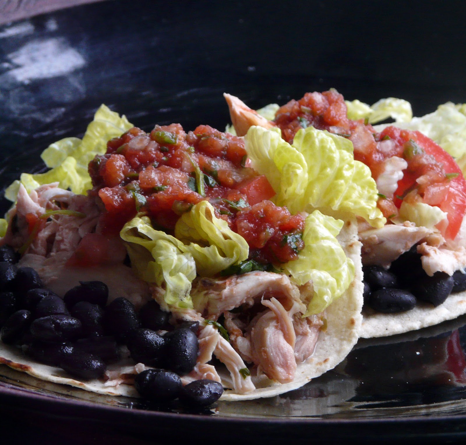 Warm homemade corn tortillas filled with black beans, chicken ,