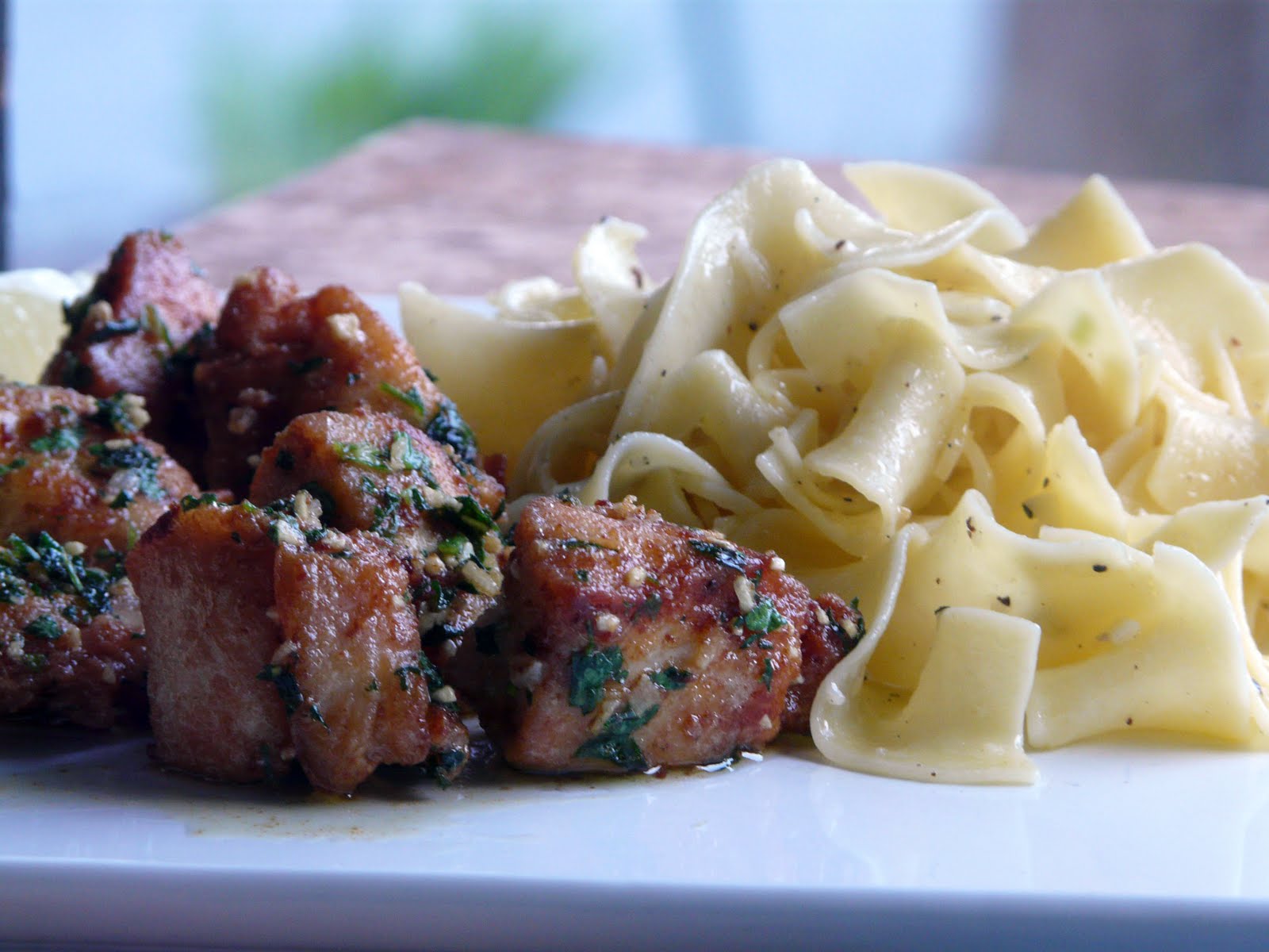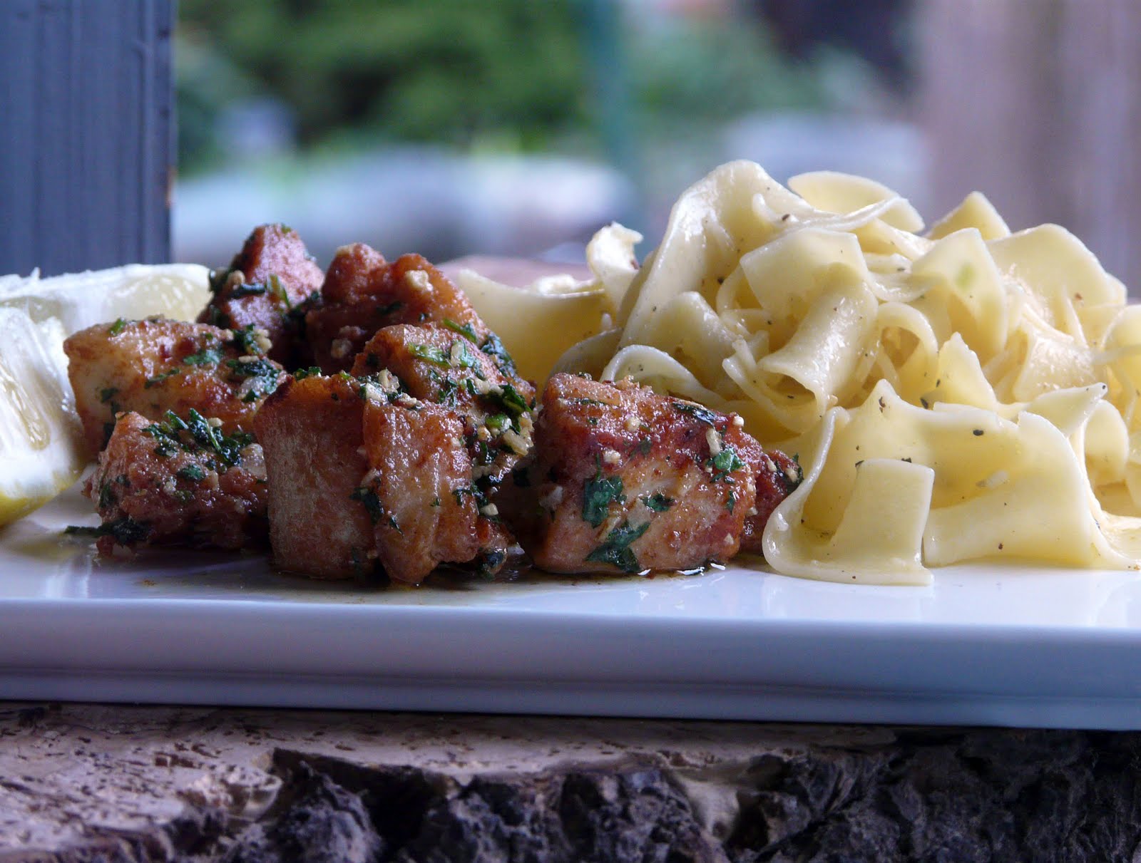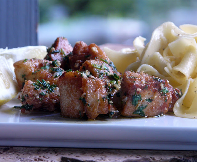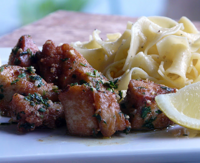 Remove from the pan and place in a low oven to keep warm. Cook the remaining chicken. When the last batch of chicken is cooked, drain off most of the oil. Add the butter and the garlic to the pan. Cook for one minute stirring so that the garlic doesn’t colour. Add the parsley and the chicken and toss to coat. Serve with rice, noodles or potatoes. Serve with lemon wedges.
