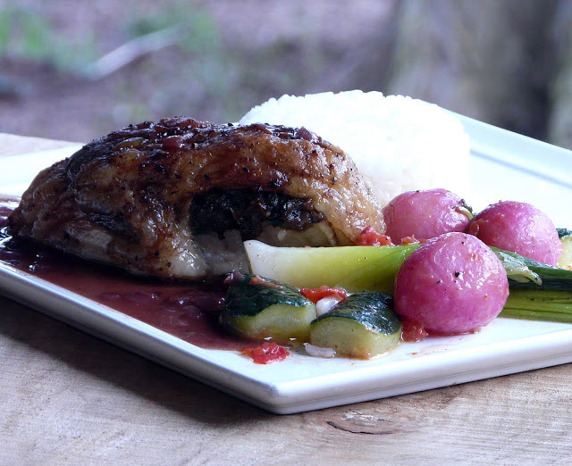 This flavorful and elegant chicken is stuffed with a combination of fresh and dried mushrooms. Because the breasts are stuffed under the skin, the stuffing moistens the chicken meat and keeps it juicy. Use either dried porcini or dried Chinese mushrooms; they have the most flavor. The sauce can be made ahead of time and the breasts stuffed a few hours before baking.