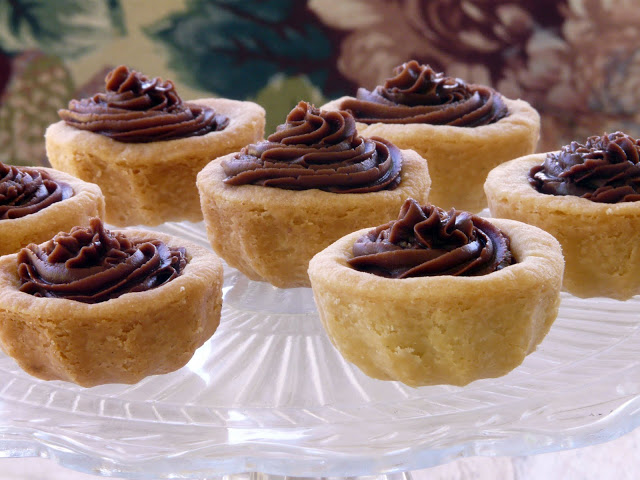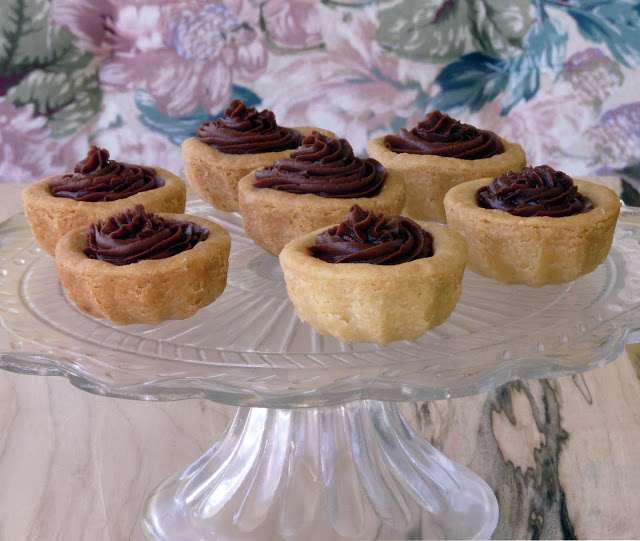 Divide the dough into about 24 balls. Press into buttered mini tart tins. Prick with a fork and bake in a 325°F oven. As the cookie bakes it will puff up. You will need to prick the cookie again and push the dough down to form the cup. Bake until pastry is golden brown. About 15 to 18 minutes. Cool on wire rack.