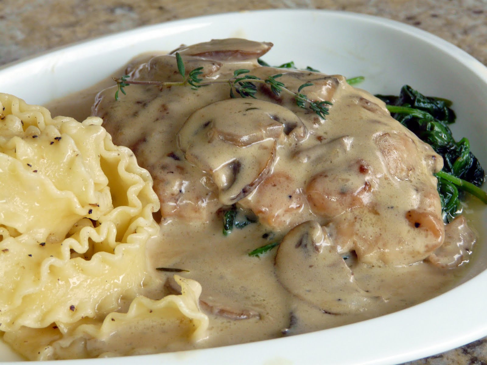 When the chicken was golden brown, it was removed from the pan. In the same pan I sauteed finely chopped shallots and minced garlic for about 30 to 45 seconds, and then added sliced crimini mushrooms. When the mushrooms were cooked, I sprinkled in about one tablespoon of flour and cooked for two minutes and then added one cup of chicken broth and one cup of heavy cream. Seasoned with fresh chopped thyme and simmered for two minutes before adding the chicken back into the sauce. Cooked another five or six minutes until chicken was fully cooked.
